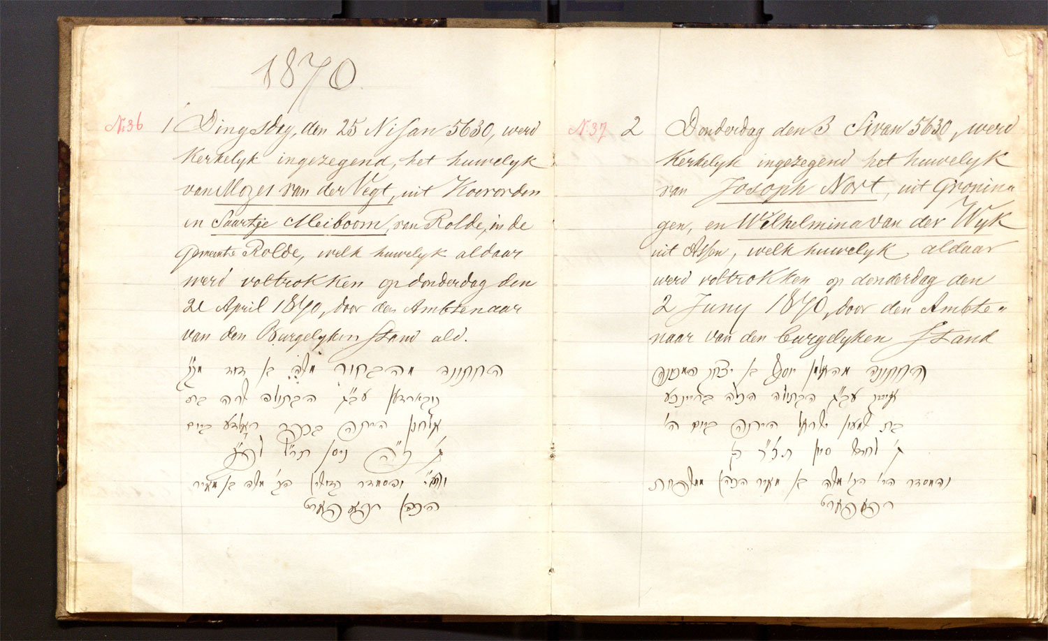 | 21.04.1870 | Mozes van der Vegt | Saartje Meiboom | Rolde | ja |